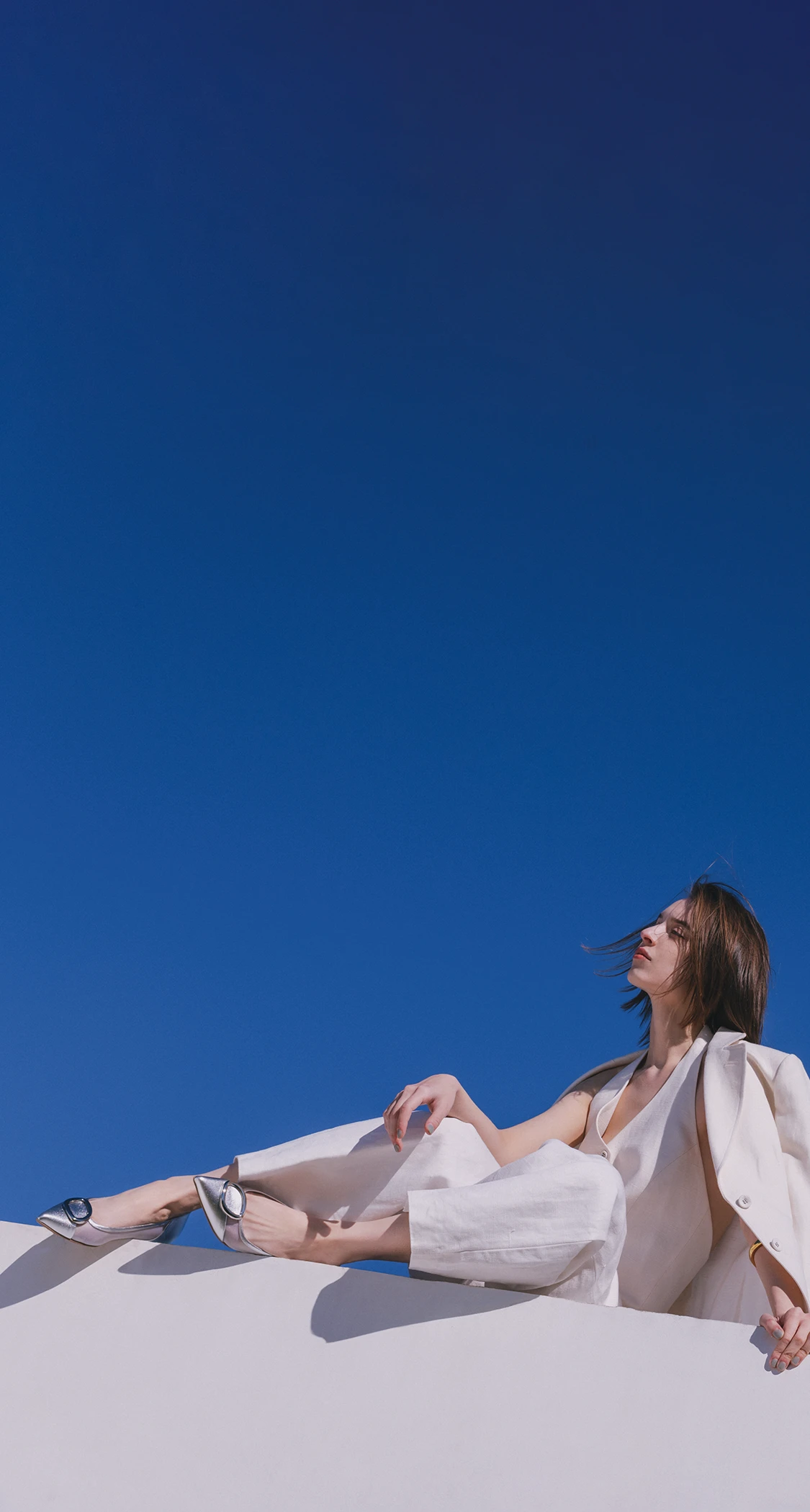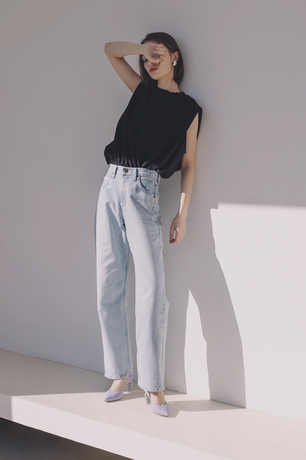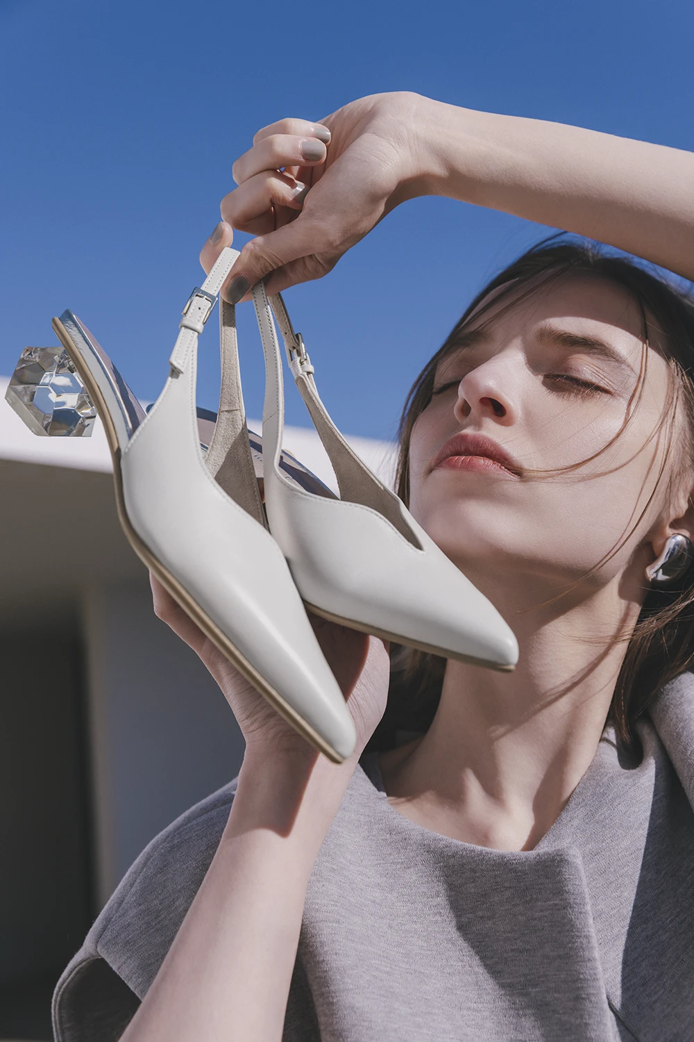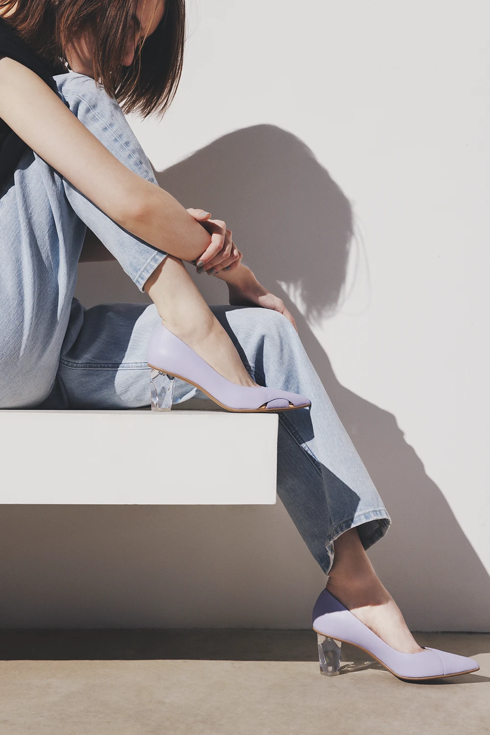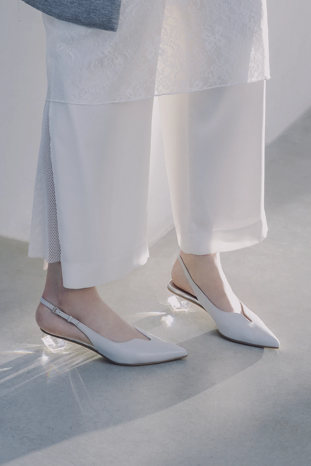 今年らしい透明感をダイヤカットのヒールで表現。深めのVカットデザインとかかとの抜け感のコントラストで凛とした女らしさを。