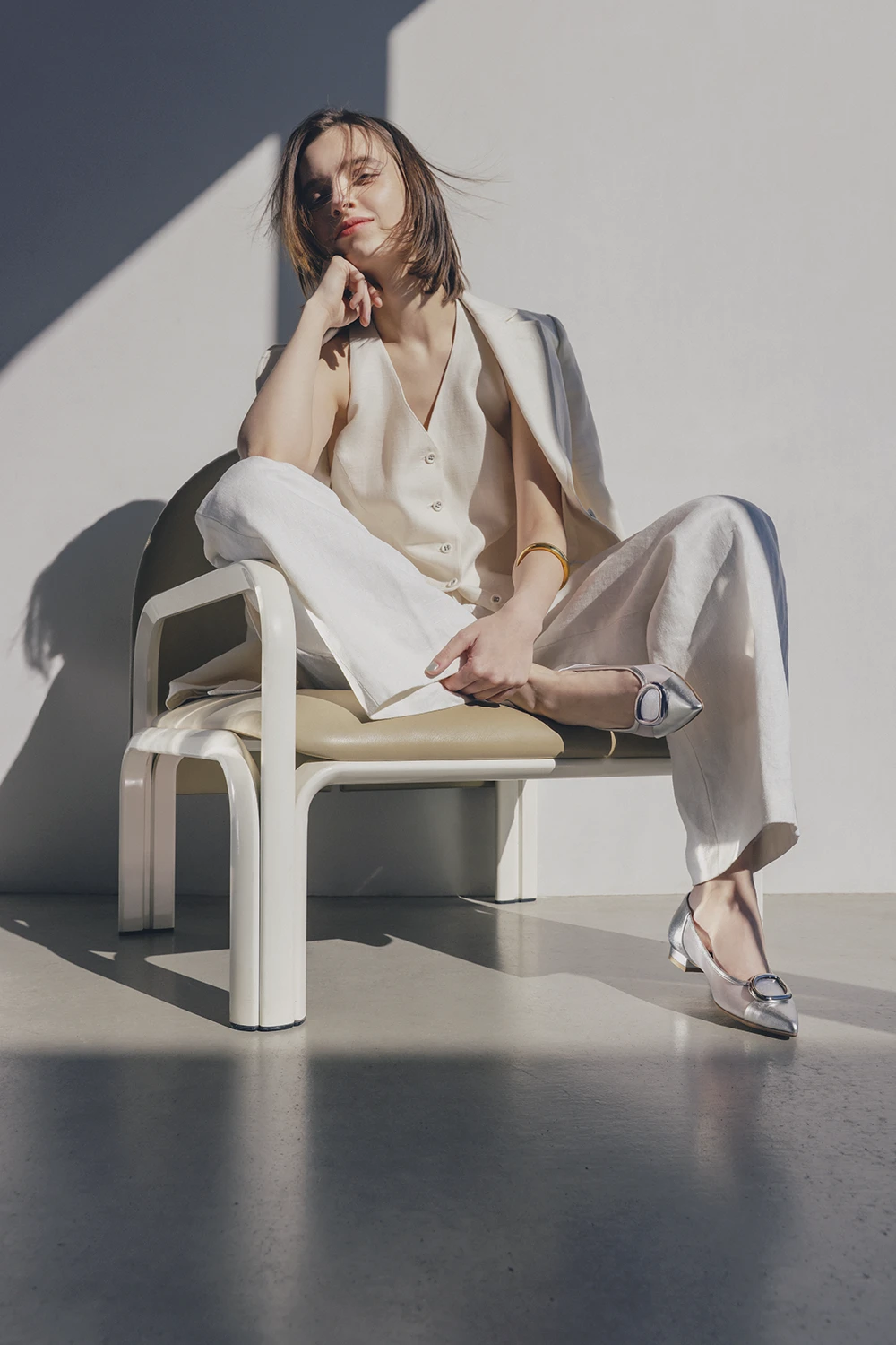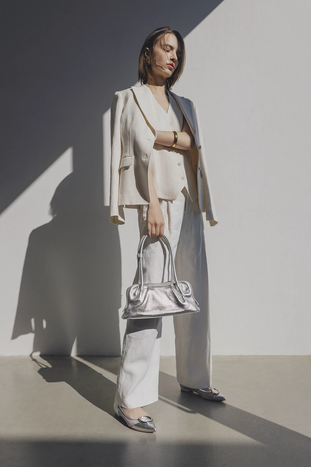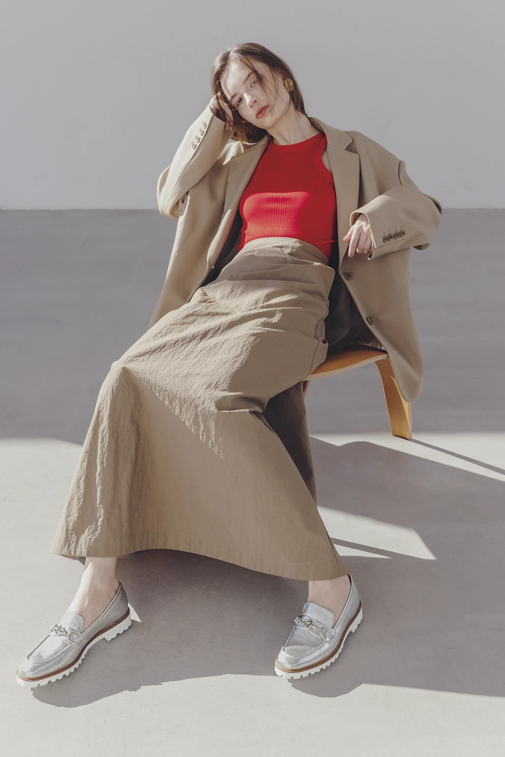 マリン風味で爽やかなローファーは、トレンドカラーのシルバーで遊びを。明るい春色と馴染みがよく、抜け感も醸せます。