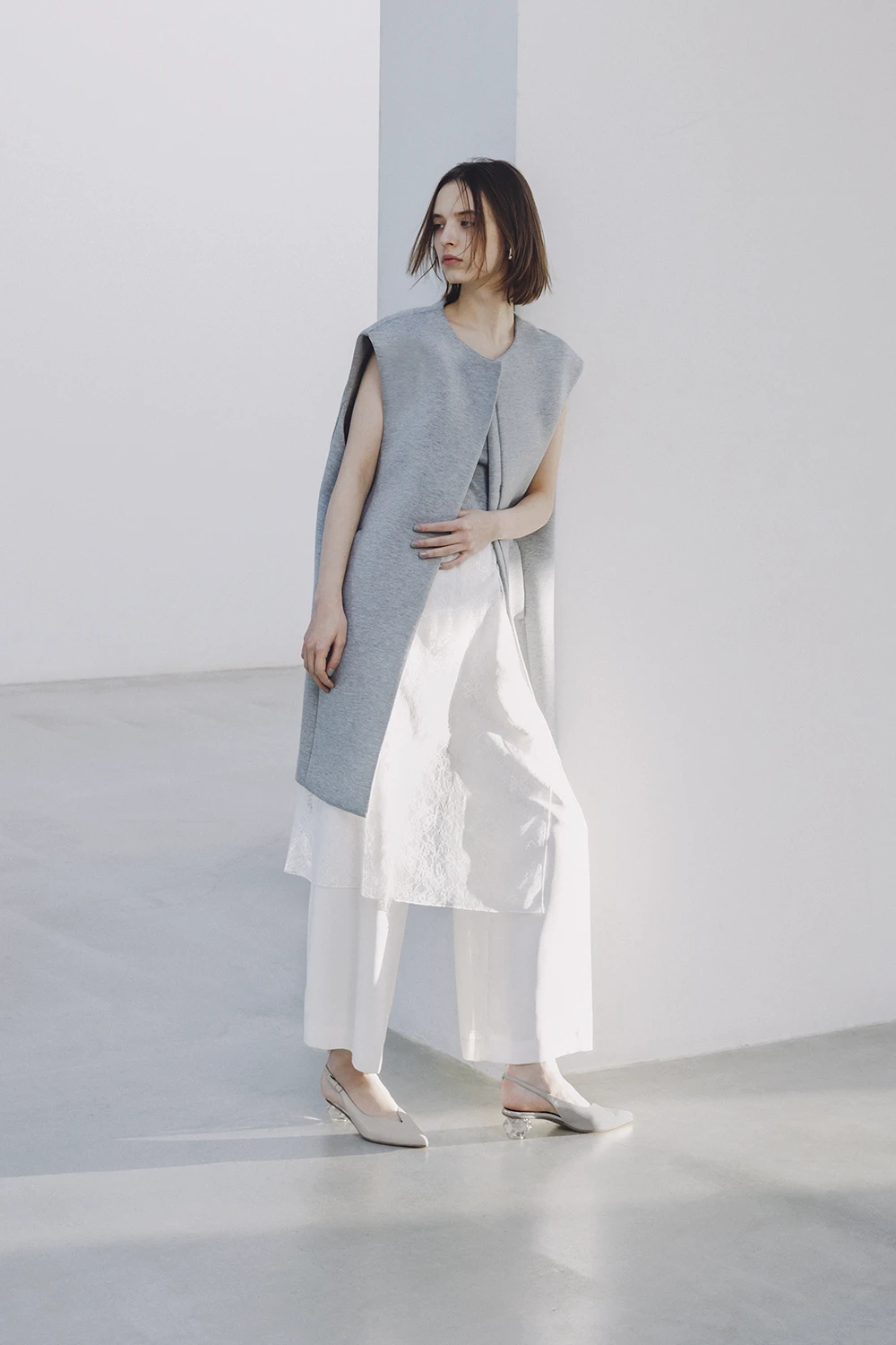 上品に素肌が透けるチュール使いが今年らしいカッターパンプスで、凛とマスキュリンに。アシメカットの履き口が洗練されたイメージ。